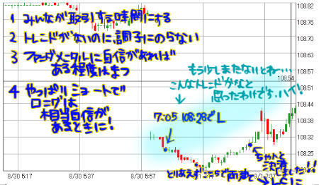 朝っぱらから失敗しました・・・ ![]() ![]() 08-09-01 07:32 決済 USD/JPY 1 108.2900 -1000 (両建てポジ決済) 08-09-01 07:32 決済 USD/JPY 18 108.3000 3600 08-09-01 07:26 決済 USD/JPY 1 108.2500 -600 (両建てポジ決済) 08-09-01 07:19 決済 USD/JPY 1 108.2000 -800 (本命ポジ決済) 08-09-01 07:15 決済 USD/JPY 2 108.2100 400 本命ポジは18のです! 本当は19でしていたんですが途中で一枚決済 ![]() たぶん-800のかな、んで-600と-1000は底値についたときに一応リスクヘッジとして両建てした2枚をそれぞれ決済したのでした! もう少しファンダメンタルに自信があったので待つべきだったかなと ![]() ![]() まーこんな流動性が低い時間帯でするのがそもそもの間違いだったんですがね・・・ ![]() ![]() いや、その・・・はやくトレードがしたかったんですよ ![]() ははは・・・とりあえず今のところ6pipsげっとーしたのであと4pips! それにしてもうざいくらいに更新してすみません・・・ ![]() ![]() ![]() ![]() 学生ランキング2位になりました ありがとうございます![]()